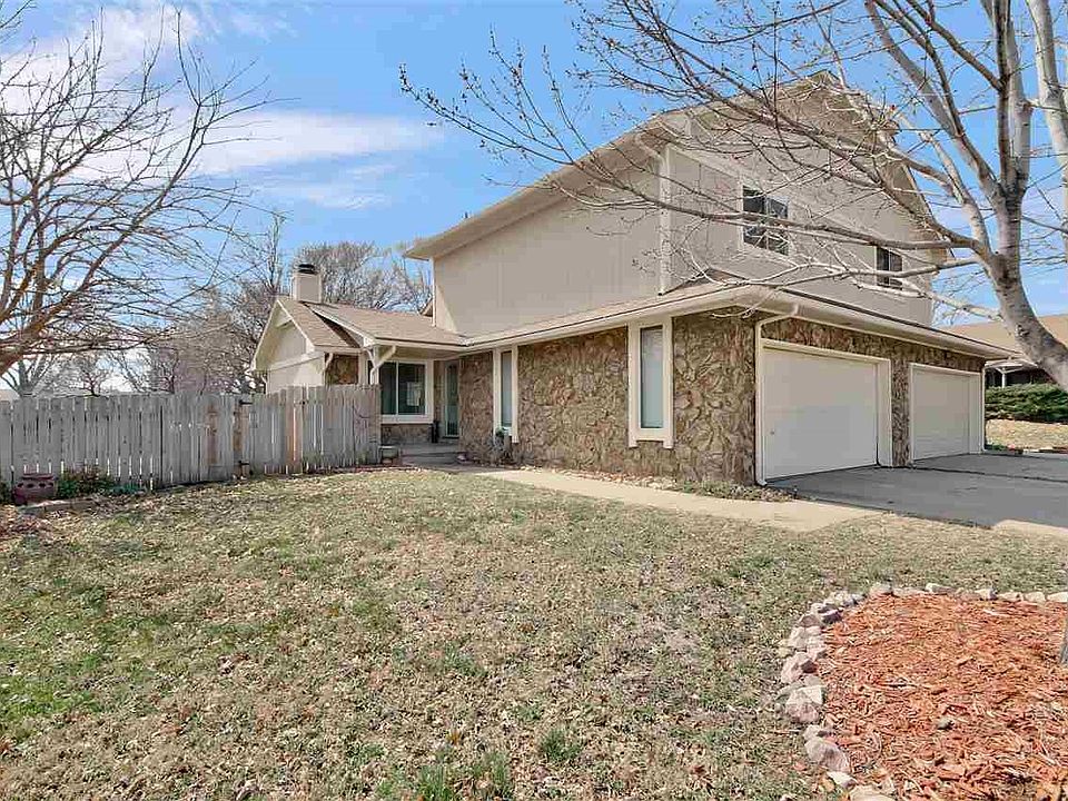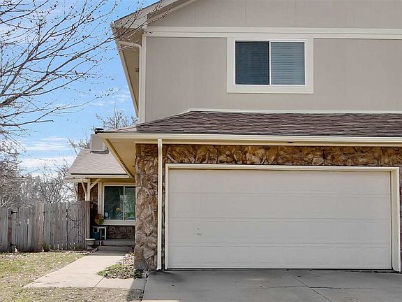 Twin home in Derby, beautiful design and charm, 2 car garage, 2 bedrooms plus oversized bonus room in basement, 3.5 baths, wood laminate flooring, vaulted ceilings, fireplace in living room, privacy fenced yard with concrete patio and pavers-great entertainment areas and so more. Wood laminate flooring throughout the main level greets you as you enter to vaulted ceilings, 2 ceiling fans, wood burning fireplace, lots of natural light and open feel to the dining and living area. Kitchen has tile counters, view through cabinets, eating bar and stainless cabinets. Main level also has drop zone off the garage and updated half bath. Upper level has bedroom with full bath that features tile counters and floors and separate laundry room is on the upper level and convenient to bedrooms. Master bedroom has ceiling fan and room for king bed and furnishings and features master bath with tile counter, barn doors for privacy to master bath and a large walk in closet. Basement has great rec room for relaxing and gathering, full bath with tile counters and bowl sink, storage and a finished bonus room that is perfect for an office, fitness room, playroom, theater room, etc. Backyard is privacy fenced and has concrete patio and decorative pavers that offer lots of space for entertaining outdoors. Get ready to enjoy the outdoors in your backyard space!