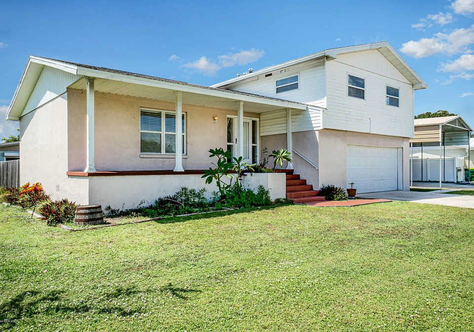 Spacious 4 bed 2.5 bath split level home within walking distance to the Banana River. Large open floor plan with wood and vinyl flooring throughout the home. Located on a large corner lot complete with a detached carport/workshop for all your toys. Detached carport has a 10 foot deep enclosed workshop with roll-up door. Inside the home you will find a spacious kitchen with plenty of counter space. On the bottom level is a beautiful wood burning fireplace centered in the living room with a half bath. All bedrooms are upstairs. Master bedroom has its own balcony with beautiful views. Great location to watch the rocket launches. This home also has an attached 2 car garage. Absolutely great location close to the ocean, port and a direct route to Orlando.