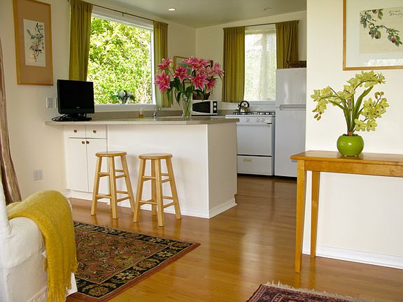 This bright and sunny studio is at the top of a hill overlooking part of Arcata and has beautiful views of the garden through the big front windows. It is a short walk to Cal Poly Humboldt or downtown Arcata to local shops, restaurants, grocery stores, and the Community Forest. Our studio is wood floors, oriental rugs, a fully equipped kitchen with lots of counter space. There is comfortable queen-sized bed with cotton sheets and down comforter. Owners pays for utilities. If bill is higher than average amount renter pays for additional amount.