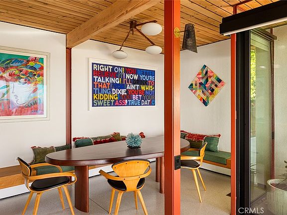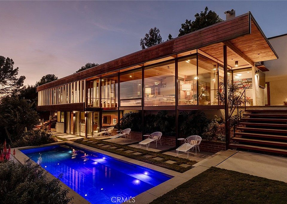 Published and recognized mid-century Case Study architect Craig Ellwood, The Bryon Lamar Johnson House, 1953 is the third in the series of Ellwood’s recorded steel hillside houses, located in Crestwood Hills of Brentwood, on prestigious Tigertail Road. Here is a great example of pedigree mid century architecture at the top of Crestwood Hills, an incredibly prized Ellwood, here you will find a meticulous restoration honoring the Ellwood design ethos. Conceptually pristine, once called “Beauty of the House of Steel” in the LA Examiner. Upgraded seismically, crisp modular frame steel columns and wooden beams enable the house to ride out from the slope creating a floating effect for the home, by night twinkling lights of LA below the living room, by day ocean views and Catalina Island. The property consists of two separate addresses. The main residence incorporates 3 bedrooms, 2.5 baths, plus new ADU 1 bed w/full steam shower bath & kitchen direct to the pool area. Whole house automation, solar panels, Tesla power walls, EV charger, brand new roof w/rooftop sprinkler, terrazzo floors, Lutron lighting, Baldwin and Fleetwood doors/windows, new sewer and gas line, motorized shades, restored gas/wood burning fireplace, water filtration, Gaggenau, Wolf Subzero appliances, outdoor kitchen w/Lynx Barbecue & pizza oven, grass lawn w/period chaise lounges, skylights, Waterworks fixtures. Every detail has been carefully curated from the furnishings to the finishes making this a truly turnkey living experience. Tigertail trailhead steps from door, minutes to Brentwood Country Mart & Farmers Market. Likely eligible for Mills Tax as a potential Historic-Cultural Monument, affords significant tax savings. History preserved and restored.