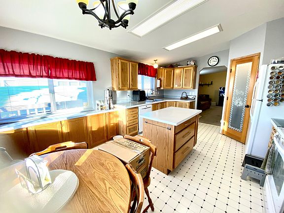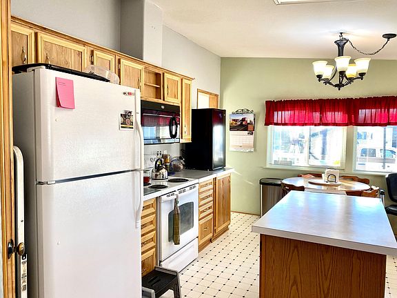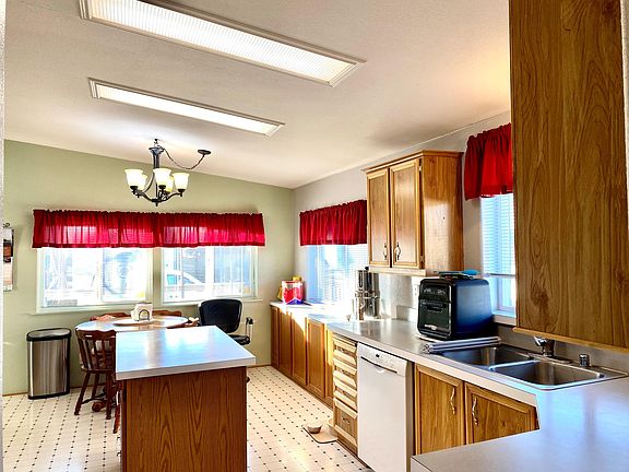 Beautiful home with amazing kitchen with large pantry, custom island and wrap around porch with large umbrellas staying for new owners. Fenced yard. Includes brand new dishwasher, newer 30 year roof and 2 storages sheds for all your needs. Light and bright with plenty of windows, vaulted ceilings, skylights, ceiling fans and pellet stove for those cozy evenings. Large primary bedroom with walk-in closet. Coleman AC heat pump and furnace serviced last year. Owner occupy only. NO SUBLEASE. $825 monthly space rent includes snow removal. Must make 3 times monthly space rent and get park approval with credit and background check. Extra Alaska insulation package added to keep utilities bills down.