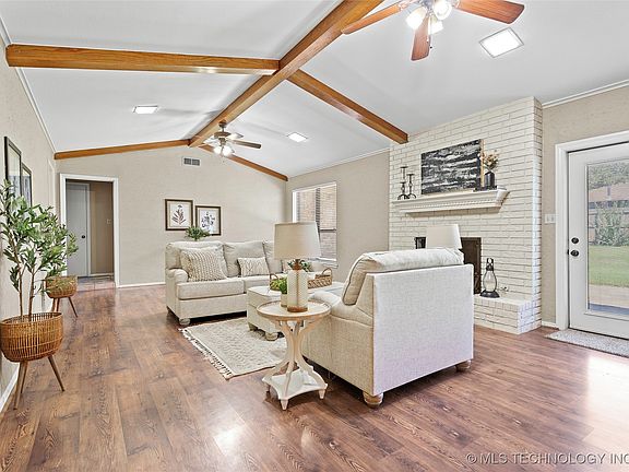 This spacious 3-bedroom, 2-bath brick home in Plainview ISD combines comfort with character. The master suite features a tiled shower with walk-in closet and private access to the back patio, ideal for relaxing or entertaining. The living area includes vaulted ceilings, wood accents, and a brick fireplace, creating a warm, inviting space. The kitchen offers granite countertops, plenty of storage, and a bright dining area. Rounded brick details on the front of the home and Southwest-style tile add unique architectural flair. Updates include new carpet, modern fixtures, and fresh paint in select areas. Additional features include an attached garage with storage, a fenced backyard, and thoughtful custom touches throughout.