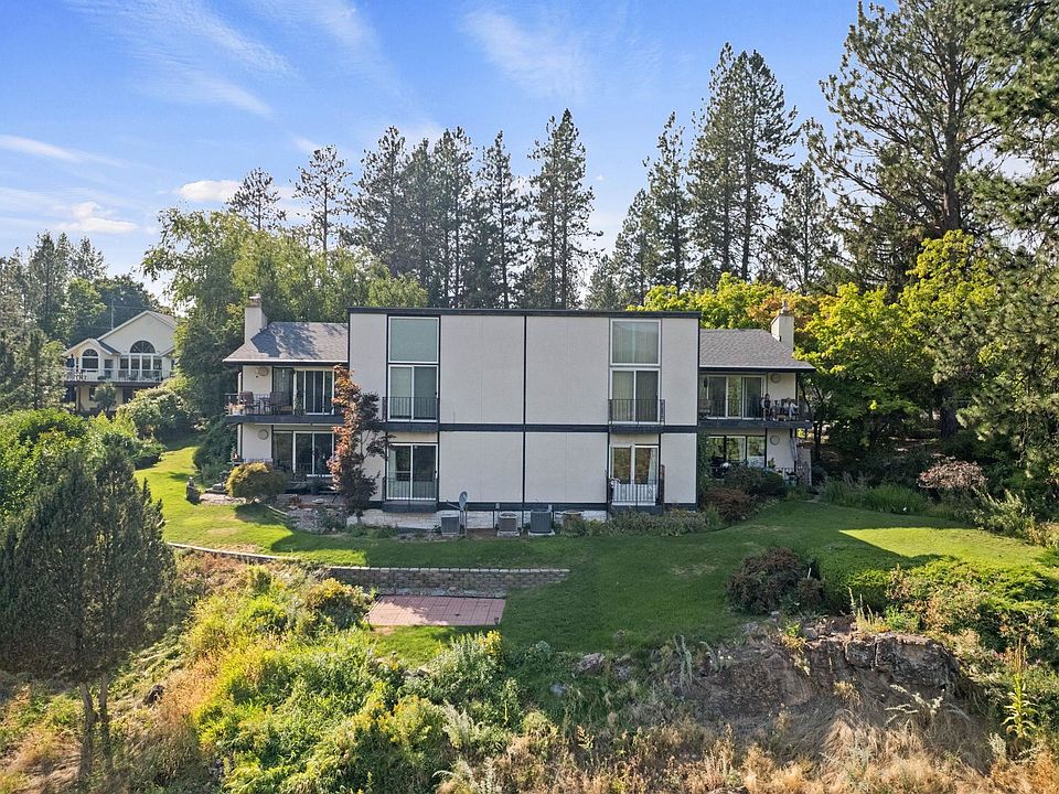 Liberty Lake Views and Access to Wicomico Beach in this ground level condo! This 2 bed, 2 bath, 1404 sq ft home boasts a large living room, the perfect place to cozy up in front of the floor-to-ceiling rock fireplace. From the living room, walk outdoors to your covered deck, take in the serene and sweeping views. The spacious galley kitchen offers pull out drawers, pantry and leads into the informal, natural light window dining space. The back door leads to another patio retreat. New plank style flooring and updated lighting fixtures. Generous sized bedrooms include built-in lighted area, abundant closet space and shelving. Built-in linen closets, Jacuzzi jetted tub in private toilet room, dual closets and sinks in Jack&Jill style primary suite. Main floor laundry with sink and pantry. HOA dues provide access the shared Wicomico Beach including, lawn and grounds care, snow removal, sewer, water, garbage, pest control and building insurance. This home offers low maintenance living.