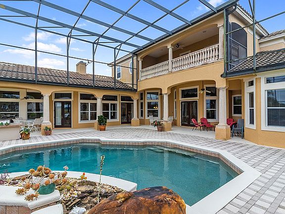 Custom built Mediterranean style home with 2 story screened in pool overlooking Lake Toho with lots of extras.