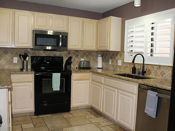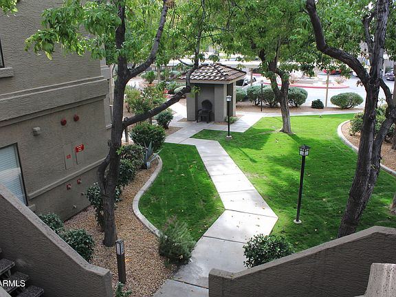 Private and peaceful end unit location in the popular gated complex of Villages North. This unit offers 1254 sq. feet of useful and well laid out living space with tumble travertine, granite , wooden shutters. New appliances including washer, dryer, dishwasher, hot water tank and updated lighting fixtures. New AC installed in 2019. Enjoy the view from your private balcony which backs to an open area surrounded with natural landscaping. The complex includes covered parking, tennis courts, community pool and and spa. Great location, close to the Loop 101, numerous shops, restaurants, walking paths and much more.