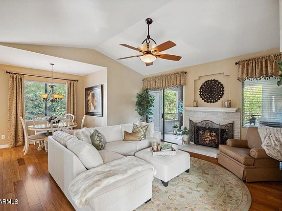 BEST HOME ON TOUR!! Exceptionally Lovely Condo with Beautiful Wood Flooring; Charming Fire Place; Expansive, Very Private Balcony; White Blinds, Stainless Appliances, Remodeled Bath. Move-in ready, Comfortably Stylish Decor. Gorgeous Sunsets viewed from the Dining and Breakfast Rooms. Gated Villages North noted for its multiple Community Pools/Spas, Tennis Courts, large green spaces and Buildings surrounded by Trees, and sidewalks that criss-cross the five intimate neighborhoods. Across the street from Horizon Park, Restaurants, Shopping; stroll across the Thompson Peak bridge to West World, Golfing and several trailheads into the McDowells. Especially lovely and pristinely maintained condominium you will enjoy visiting and be proud to own!