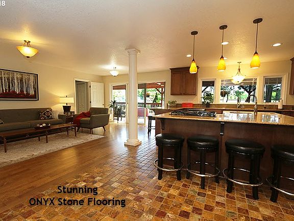 Wonderful 2-acre estate completely renovated in 2010. 3 large ensuite bedrooms, sought after main floor master, HUGE rec room could be transformed into 3 bedrooms, unique Onyx flooring, chef's kitchen with custom cabinetry, large cooking island, granite countertops, stainless steel built-ins. Meticulous fenced grounds with 2 stall horse barn & corral, pool, huge garden area, chicken coop, only 5 minutes to I205 & a mile to CCC and OCH!