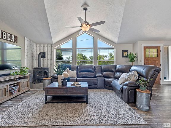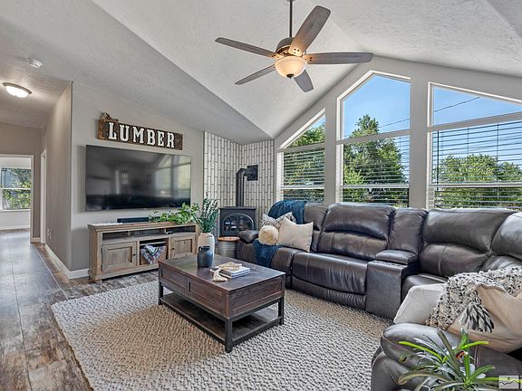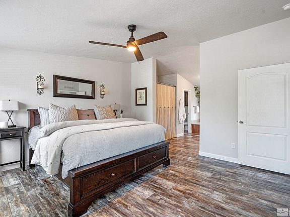This 2020 well maintained and upgraded manufactured home on .5 acre is a rare find in South Reno located down a quiet lane with peaceful views of the nearby mountains. Enjoy your morning coffee or evening beverage on the covered deck in the backyard overlooking the lush lawn with many sounds of nature and views of the rolling mountains as your backdrop. The privacy wall on one side and string of patio lights add to the evening ambiance., You will love the large Kitchen with a 4' x13' walk in pantry, island and swivel chairs for seating. Enjoy the cozy free standing gas fireplace in the living room which heats the entire area on those cold winter days. Upgrades include a water filter at the kitchen sink and on demand water heater. RV parking and hookups for electric and sewage clean out. The detached 2 car garage includes a toilet room and utility sink and is fully sheet-rocked.