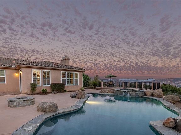 Immaculate single-level home in El Cajon with unobstructed views! ***Entertain friends and family in the resort style pool and jacuzzi. ***Built in BBQ with a large bar area, built-in firepit, and several gathering areas. ***Huge, elevated Trex deck with sprawling views of the valley and mountains. ***Large private lot, just under three acres. ***Bright and open living space with tall ceilings and great natural light. ***Formal dining room and dedicated wine room with built-in wine storage and refrigerator. ***Massive center island, granite counters and backsplash, and double ovens in the kitchen. ***Spacious and open family room with built-in media niche, fireplace and large sliders leading outside. ***Master bedroom with a huge walk-in closet and en suite bath including dual sinks, soaking tub and separate walk-in shower. ***Secondary bedroom with its own en suite bathroom. ***Pergola entry with natural stone pedestals. ***Two heating and central air conditioning systems. ***RV Parking.