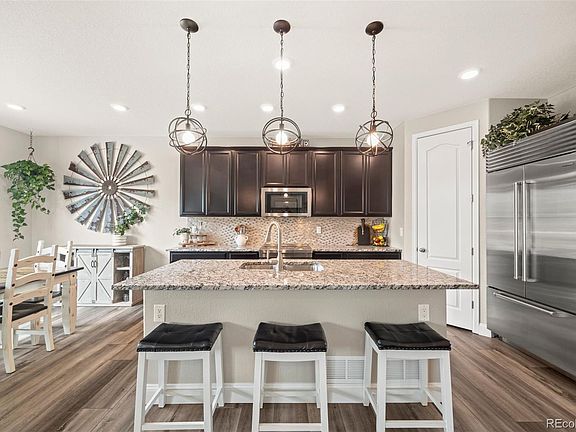 Visit 15155ChicagoSt.com for highlight video, 3d tour, 2d floorpan, and extra photos! Welcome to 15155 Chicago Street, nestled in the desirable Sierra Ridge community of Parker. This beautifully appointed 4-bedroom, 4-bath home offers 3,139 total square feet of stylish and functional living space on an expansive lot designed for entertaining and everyday comfort. Step inside to find extra-wide luxury flooring flooring throughout the main level, complemented by designer touches and abundant natural light. The chef’s kitchen is a true standout, featuring high-end JennAir appliances, a luxurious built-in Sub-Zero refrigerator, a large island with bar seating and under-mount sink, slab granite countertops, and a corner walk-in pantry. The dining area and spacious great room flow seamlessly, perfect for gatherings. A powder room and a convenient mudroom bench complete the main level. Upstairs, you'll find four generously sized bedrooms, including a grand primary suite with a coffered ceiling, an updated five-piece ensuite bath with a walk-in shower, soaking tub, and a spacious walk-in closet. Three additional bedrooms, a full bath, and a large laundry room offer plenty of space and convenience. The finished basement is an entertainer’s dream with a full bar area, complete with a full-size fridge and beverage fridge, a large rec room/media room, a half bath with a utility sink, and a generous storage room. Outdoor living shines with a composite deck, cement patio, large lawn, several trees and gas line ready for your grill and fire pit. Located in the vibrant Sierra Ridge community, residents enjoy access to multiple parks, a basketball court, playground, clubhouse, and a community pool. Additional highlights include a whole home humidifier, active radon mitigation system, overhead garage storage racks, raised garden beds, and an inviting covered front porch. Don’t miss the opportunity to own this beautifully finished home in one of Parker’s most desirable neighborhoods!