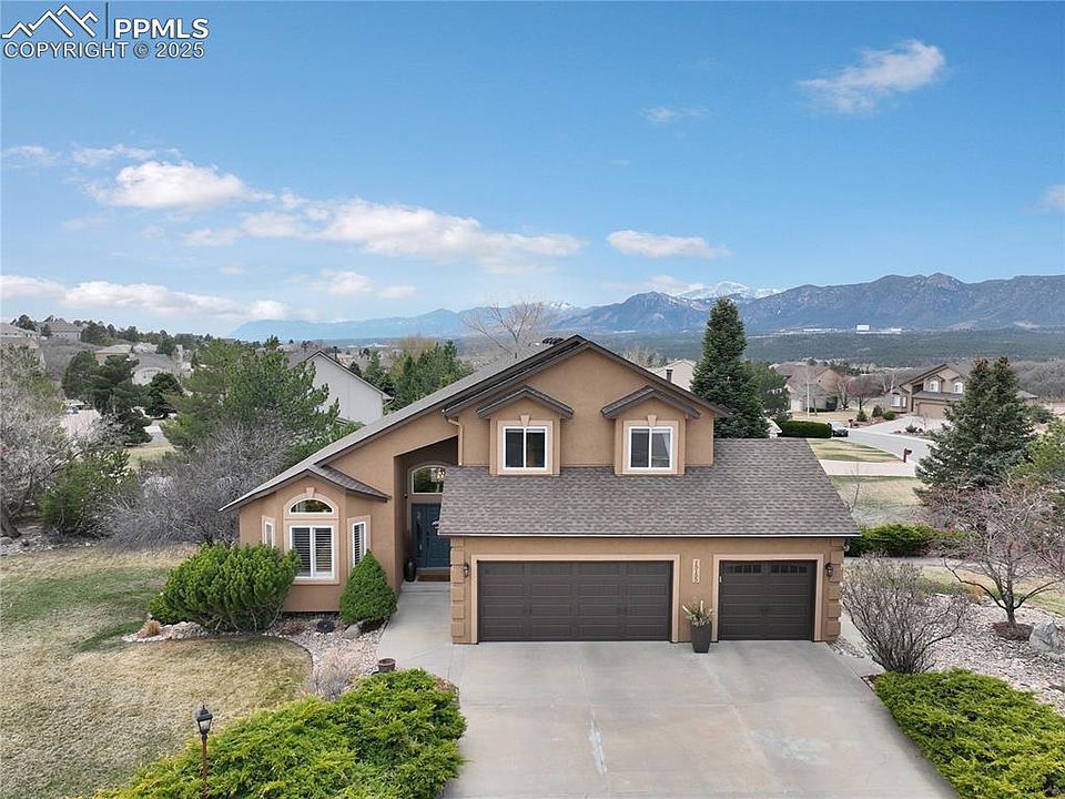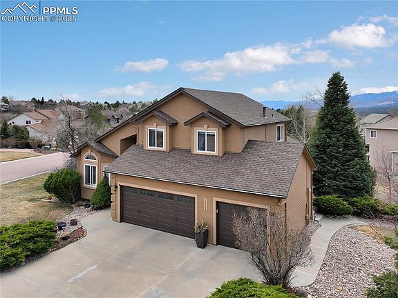 Welcome to your dream home—where comfort, style, and stunning views come together on a fully landscaped, private corner lot. This meticulously maintained 4 bedroom, 3.5 bathroom home offers main level living and a thoughtfully designed open floor plan. Step inside to refinished hardwood floors and a bright, inviting main level featuring a spacious living room with vaulted ceilings and a cozy gas fireplace adorned in Evolve stone from floor to ceiling. The open-concept kitchen is a true centerpiece with stainless steel appliances, a large island, and a sunny dining area just steps away from the custom composite deck—perfect for enjoying the incredible views of Pikes Peak and the Front Range. There is also a sitting room adjacent to the formal dining room. You'll love the convenience of the main-level laundry room, powder room, and a fully renovated primary suite complete with a luxurious 5-piece bath and custom walk-in closet. Upstairs, you'll find a versatile loft space, two generously sized bedrooms, and a full hallway bathroom. The finished walkout basement is a dream with a large bedroom with walk-in closet, an oversized bathroom, a wet bar with a sink and dishwasher, a spacious living area, a game room, an office space, and multiple storage options. There’s even a flex space for gym equipment! Step outside to the poured patio to take in the beauty and privacy the yard offers. Enjoy impeccable curb appeal with mature landscaping, a U-shaped driveway, and a spacious 3-car garage with upgraded doors featuring insulation, windows and custom hardware. The garage also has a pedestrian door for added convenience. Year round comfort is a breeze with AC, smart thermostat and smart sprinkler controller. Every detail has been carefully maintained, making this home truly move-in ready. Within walking distance of a D-20 elementary school and several parks and trails, this home is the perfect blend of comfort, function, and breathtaking beauty—you won’t want to leave!