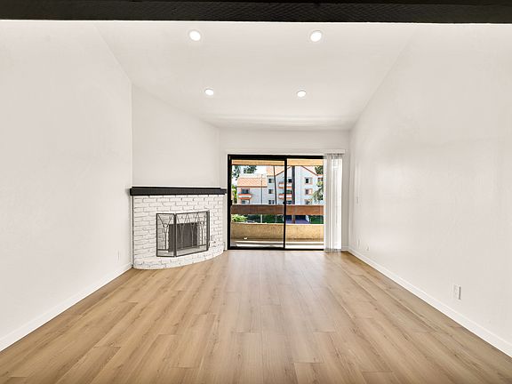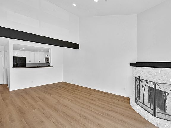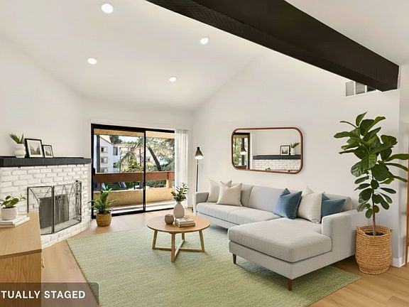 The unit boasts a modern kitchen with soft-closing cabinets, a stove/oven, microwave, and dishwasher. The living room has a vaulted ceiling, a fireplace, and opens to a large balcony. The condo includes an in-unit washer and dryer, a new Nest thermostat, central air/heat, and recessed lighting. The entire unit has new laminate flooring with sound-proof subflooring. Both bathrooms have been updated with new vanities and quartz countertops.
