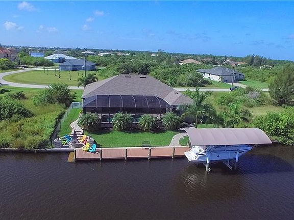 ABSOLUTELY STUNNING!! waterfront home. This luxury home is loaded with details and upgrades GALORE and MOVE IN ready. Located in the upscale boating community of SOUTH GULF COVE SEC 93 with direct access to the Interceptor lagoon and the Gulf of Mexico, no bridges to Charlotte Harbor. This home features three spacious bedrooms plus den with French glass doors. Crown molding and porcelain plank flooring throughout the home, 12 ft coufered ceilings with wood beams, built in bookcases and cabinets with stone backing, home is wired for surround sound, Master bedroom is oversized with sitting area and bay window, his & hers closet . Kitchen features stone counter tops, 42 inch cabinets with upper glass cabinets, under cabinet lighting, pot and pan soft close drawers, pantry and desk, Kitchen aid oven and convection oven and wine refrigerator. Aquarium window in dining area overlooking pool and waterfront. As beautiful as this home is inside, the outside living area is where you will be, pebble tec salt water heated pool and spa, 50 ft trek dock with 12000 lb covered boat lift, also drive on jet ski dock, kayak dock, under water fish lights for your enjoyment when you sit around the newly constructed fire pit/sitting area. pavers in the driveway and lanai, st.augustine grass, irrigation, stone front facade oversized garage with 8 ft doors, fenced back yard. this is truly a one of a kind home, come live the FLORIDA LIFESTYLE