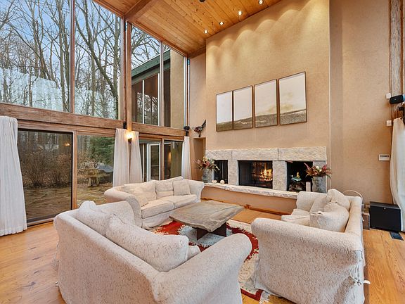 Contemporary design meets rustic chic in this stunning 3BR/2.5BA with great private beach! Every detail has been carefully considered and inspired by nature to create a stunning and distinctive design. The open floor plan is defined by a wall of floor-to-ceiling windows that span the kitchen/dining and living spaces. A massive fireplace anchors the living area, while the kitchen is appointed with custom cabinets by local artist Mark Stevens, and a generous island with seating. The custom staircase, second floor railing and dining table were also designed by Stevens. Den w/fireplace opens to 2-story screen porch. Main floor master with well-appointed jacuzzi bath. Guest house is 24'x24' with full bath! Shady Lane association private beach is just steps away from this Lakeside stunner!