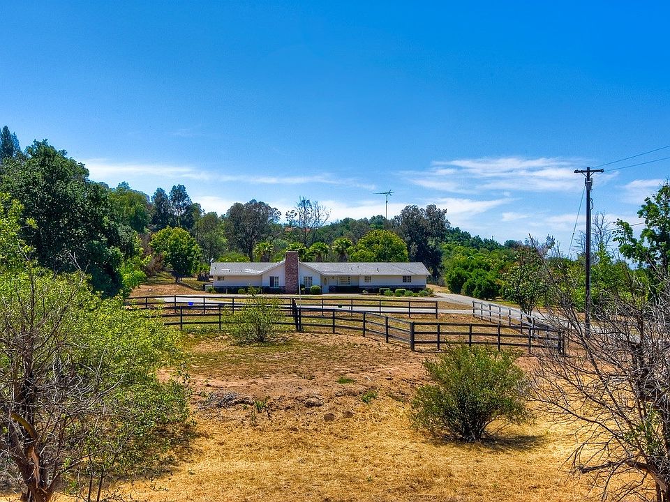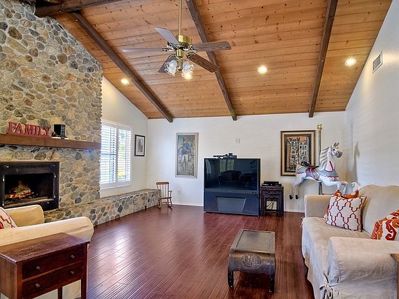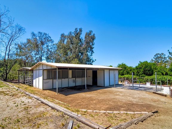 Wonderful fully fenced horse property with over 2 acres 2 stalls tack room 4 fully covered pipe paddocks 2 crosstie/wash racks and 90x90 arena! Acres of riding trails can be accessed directly from the property. This spacious home consists of over 2000 SF 3 bedrooms 3 full baths oversized 2 car garage open family room kitchen and dining! The family room has loads of charm with soaring wood beamed ceilings and huge stone fireplace. The master bedroom is also extremely large with walk-in closet!
