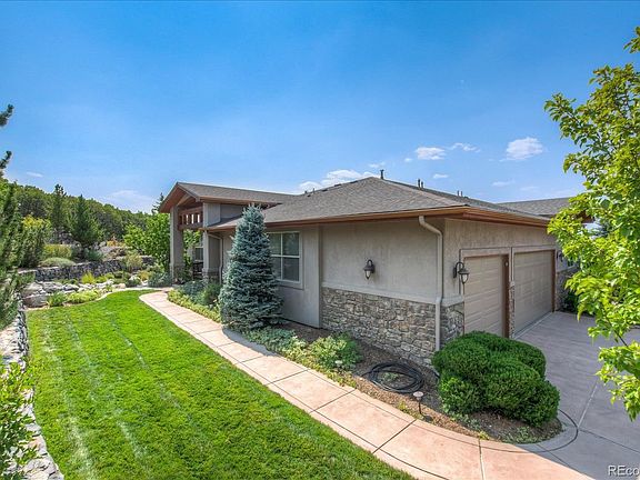 OFFER RECEIVED!! PLEASE SUBMIT HIGHEST AND BEST OFFERS BY 12:30 THIS AFTERNOON (FRIDAY). Stunning custom ranch style home in the prestigious Painters Ridge neighborhood of Crystal Valley Ranch. Located high along the ridgeline, this home features million-dollar mountain views from Pikes Peak throughout the Front Range, as well as direct access to miles & miles of trails & yet still provides privacy galore! The home boasts resort-style living with its picturesque setting, panoramic views, and incredible landscaping including an amazing water feature with two waterfalls, 60+ mature trees & large rocks. Three carefully positioned covered outdoor living areas provide maximum enjoyment no matter what time of day or what season. After dark, LED landscape lighting lights up the stream, the soothing waterfalls, Japanese garden-like plants, rocks & pergola. This luxury home has absolutely beautiful interior finishes! Open floor plan -- gourmet kitchen w/double oven, gas cooktop, granite counters & eating area w/views, opens into family room w/fireplace, rock accent wall, & built ins. Formal dining room, huge den/office, 2nd bedroom with en-suite bath, laundry room. Oversized Main Floor Master Suite has door to deck to enjoy the views, plus fireplace and 5 pc bathroom, jetted tub & walk in closet. Finished walkout basement w/amazing wet bar, media area, 2 large bedrooms and 1-1/2 bathrooms. New carpet and refinished wood floors throughout, 10 ft ceilings, 8 ft tall solid core doors, skip trowel texture, plantation shutters, crown molding & much moreâEUR¦ New roof (2018), copper gutters (2018). The oversized 3+ car garage has built in cabinets, a workbench, epoxy floors, and provides tons of shop space and for toys. Come see this ultimate luxury home perfect for both everyday, Colorado life & entertaining!