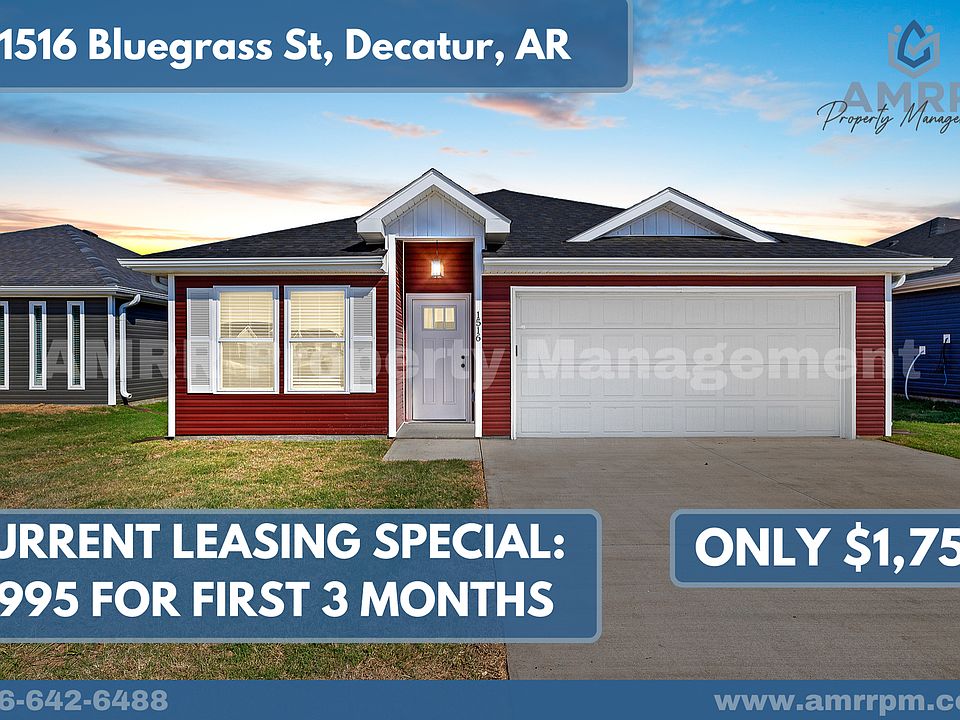 Qualified applicants pay only $995 for the 1st 3 months of a 12+ month lease. Rent reverts to $1,750 monthly after the initial 3 month period! Welcome to your new home with AMRR Property Management, featuring 1,505 square feet of living space, 4 bedrooms, 2 baths, and a 2 car garage. This new construction home is located in the quiet development of Columbia Crossing in Decatur, Arkansas and it has everything you need in a rental. The kitchen features a stove, microwave, dishwasher, custom cabinets, a stainless steel fridge, and vinyl flooring that extends throughout the home, which means NO carpet whatsoever. The backyard includes a relaxing covered patio and a spacious grass backyard. Length of lease can be between 12 and 24 months. Utilities are ALWAYS the responsibility of the tenant, unless otherwise advertised. Tenants are responsible for all lawn care and maintenance during tenancy, unless otherwise advertised. Security deposits are required for most properties, but we offer various deposit amounts and payment options, which are determined during the application process. Application fees are generally $45 but few can waive the application fee if an application is filled out within 24 hours after you complete a scheduled showing with one of our leasing agents. Normally, only 2 pets are allowed per property and we charge a one-time pet fee of $250 per pet, with no breed restrictions or weight limits, unless otherwise advertised. No smoking of any kind is allowed inside the property or garage.