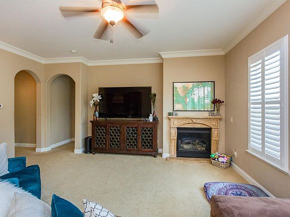 Enter through the wrought iron gates of Granville's Tuscan Bluffs to this Mediterranean Serrano model. You will be impressed by the many upgrades throughout this beautifully appointed 3 bedroom, 2 bath home; large tiled flooring, textured walls, plantation shutters, wide crown molding and an added desk nook. This floor plan provides a master suite separated from secondary bedrooms for added privacy. The kitchen with it's upgraded granite is open to the great room making a perfect setting for entertaining. The laundry room has added cabinets and sink. Oversized closet space is noted throughout this home. A Rennai tankless water heater is another special feature of the home. Stepping outside you will see the stamped and colored concrete. The relaxing backyard's lush landscaping includes various fruit and old olive trees.