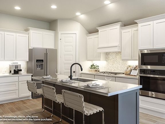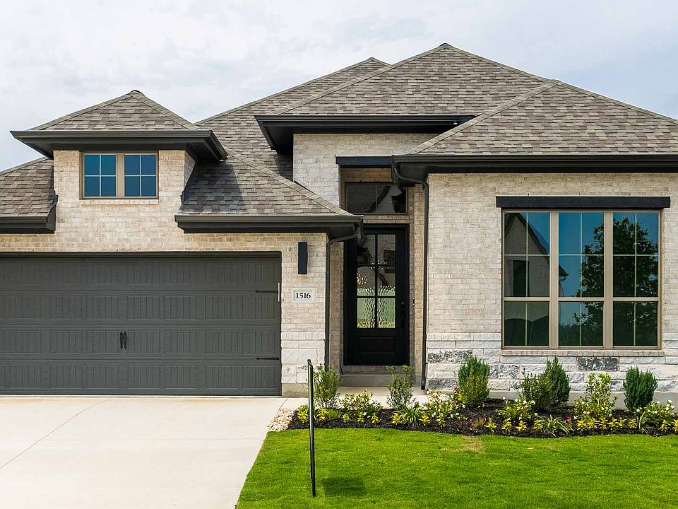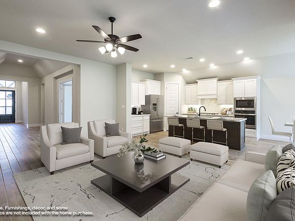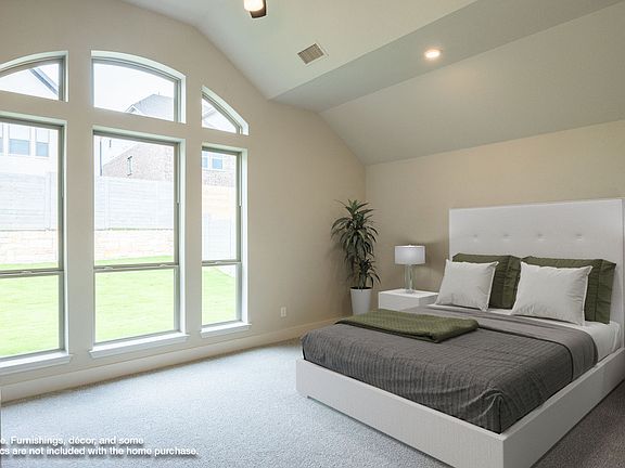Entry welcomes with 12-foot ceiling. Game room with French doors and 12-foot ceiling off coffered extended entry. Spacious family room with wall of windows opens to kitchen and dining area. Kitchen features generous island with built-in seating space and 5-burner gas cooktop. Private primary suite includes bedroom with 12-foot ceiling. Dual vanities, freestanding tub, separate glass-enclosed shower and two large walk-in closets in primary bath. Abundant closet space and natural light throughout. Extended covered backyard patio. Mud room off two-car garage. Representative Images. Features and specifications may vary by community.