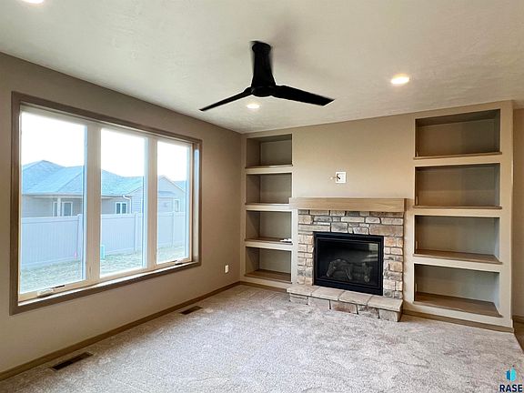 Spacious villa featuring an extra flex room ‘Sun Room’ and large fireplace with custom built-in shelving in the living room located at the Meadowland Villas in western Sioux Falls. Zero-step entry and single-level living coupled with modern-style door levers, luxury vinyl plank flooring, and extra wide hallways offer a low-maintenance and easy-living lifestyle. The kitchen features Bonno granite tops in an exotic blend of white and black, tile backsplash, extremely durable Silgranit Blanco sink, large walk-in pantry, and full appliance package in fingerprint resistant stainless steel. Upgraded laundry room includes bench and cubbies, dedicated closet, and deep laundry sink. Enjoy your outdoor space with two separate covered patios and additional space in the garage for equipment, toys, or storage. The master suite includes dual sinks, granite tops, elegant custom tile shower, and large walk-in closet. The HOA covers lawn, snow, and garbage services. Includes lawn and sprinklers.
