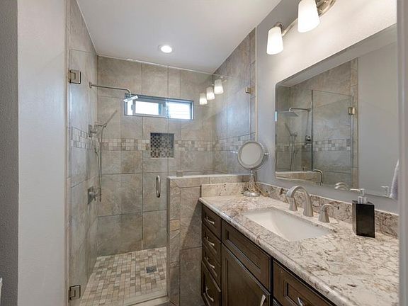 This home has the perfect set up. There are two bedrooms and one bathroom downstairs and two bedrooms and two bathrooms upstairs. There is a formal dining area and living room with fireplace. The kitchen is upgraded with granite and sizable breakfast nook. There is a two car garage with alley access and large RV parking. There is an extra bonus...on the backside of the garage is a "great room" with a fireplace...makes a perfect game room or you name it! The home is ready to move in with fresh paint, upgraded and remodeled bathrooms and kitchen. $1000 Additional Solar Panel Deposit.