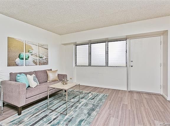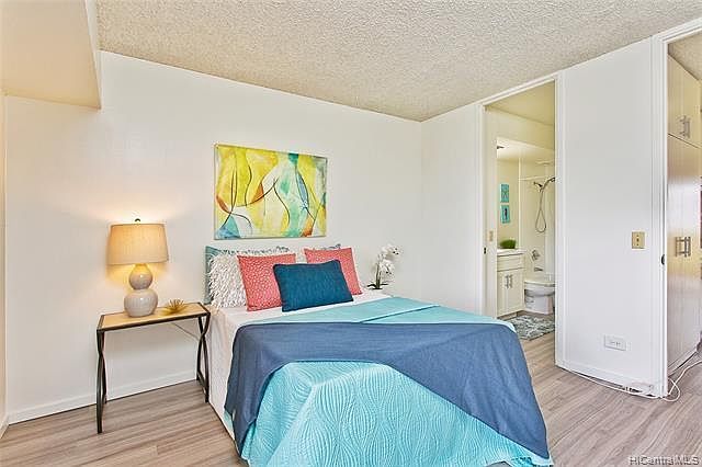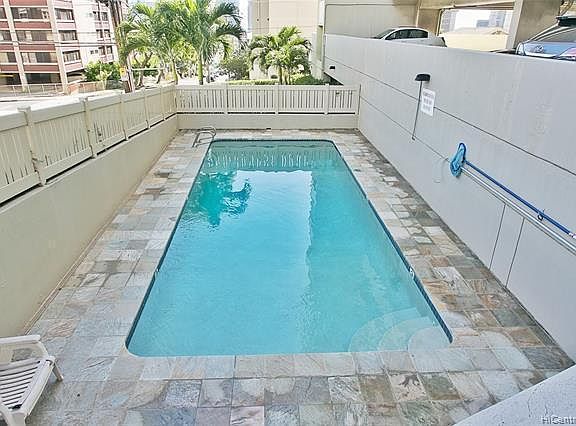 Turnkey remodeled high-floor, just below the penthouse, 1-bedroom value in secured building. New vinyl plank flooring, new countertops, new tub enclosure, new bath vanity, new sinks & faucets, new paint, and new front door. Central Honolulu location and yet quiet with remarkably tranquil usable lanai and impressive coastline / city views. Comes with one large covered parking stall.