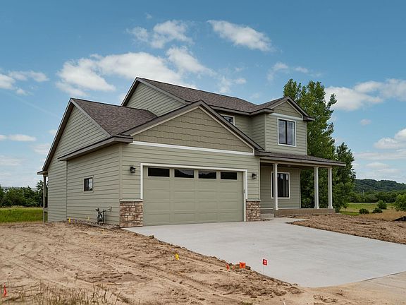 New Construction two story on a walkout lot with expansive bluff views. This beautiful home has it ALL. Main floor laundry room, Mud room, Powder room and main floor den/bedroom. Insulated 2 stall Garage. Quartz countertops and stainless steel appliances are some of the notable items. 3 bedrooms including the owners suite and a shared bathroom on the second level. Unfinished Basement has the flexibility for one bedroom, a full bathroom, a large family room or additional bedroom with a Walkout patio door. Large poured patio and covered deck are ready for all your summer entertaining.