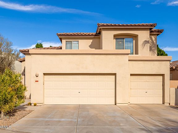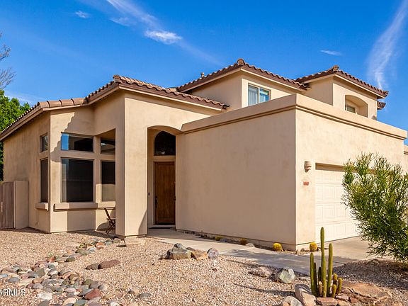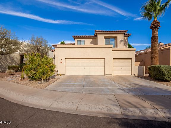Welcome home to this stunning 5-bedroom, 3-bathroom property, perfectly situated in Scottsdale near restaurants, shopping, and parks! As you arrive, you'll be greeted by gorgeous curb appeal, a cul-de-sac lot, 3-car garage and beautifully manicured desert landscaping. Inside, the pristine interior features soaring ceilings, tile flooring, and a calming color palette. The living and dining area boasts dark wood flooring and convenient access to your private oasis of a backyard. This stunning backyard features a sparkling pool, surrounded by lush landscaping, turf lawn, and no homes behind for ultimate seclusion. The spacious patio is perfect for outdoor dining and gatherings, making it an ideal retreat for relaxation and entertainment. Complete with owned solar panels to keep the utility bills at a minimum. The oversized great room includes sliding doors that open to the outdoor space, complemented by charming bay windows in the breakfast nook. You'll love the kitchen, which showcases hardwood cabinets with crown molding, a mosaic backsplash, granite countertops, stainless steel appliances, and a center island. Retreat to the serene main bedroom, featuring plush carpeting, a cozy sitting area, and a luxurious ensuite bathroom complete with dual sinks, an enclosed steam shower, heated floors, a soaking tub, and a generous walk-in closet.