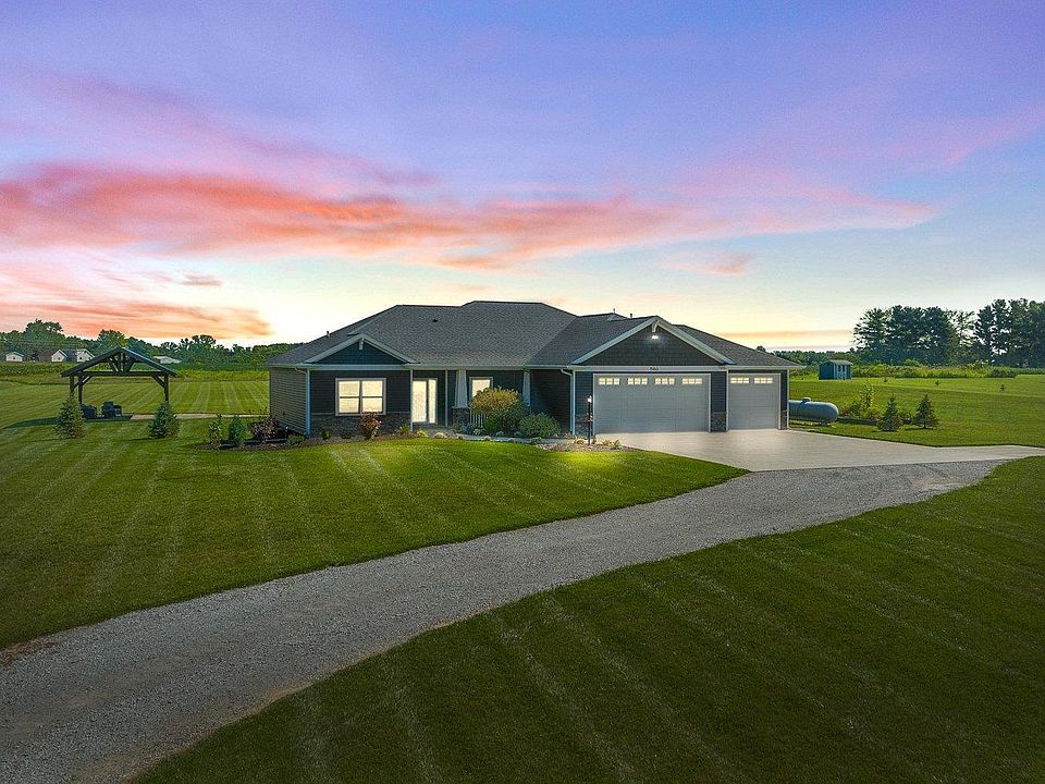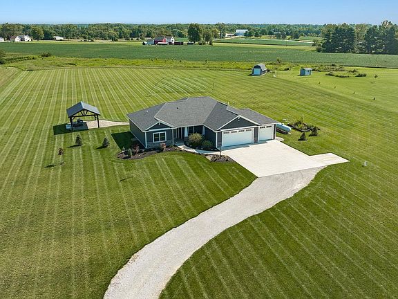 Contingent accepting backup offers. Quality construction home that is only 4 years old. This beautiful home situated on a 5 acres country side, 2 miles from I-469. 2,161 square feet over one spacious OPEN level, excellent flow for entertaining & daily family life. This RANCH offers Split Bedroom plan, 10 foot ceilings in the Great Room, Dining Room and Kitchen, 9 foot everywhere else. Spacious Great Room features large windows and ceiling fan. Kitchen features Breakfast bar, Custom Cabinets, Granite Countertops, Walk-In Pantry, and high end appliances. The inviting Dining room opens to a patio that connected to a custom built pavilion (20x16). Master suite with tile shower, 6 feet soaking tub, granite countertops, and a large walk-in closet. The other 2 bedrooms share a full bath. Other upgraded features include 2x6 wall construction, spray foam insulation, oversized garage doors: 18x8 and 9x8, 1000 gallon owned propane tank, Anderson 400 Series Windows, Built in generator hookup, propane and electric hookup for stove and dryer. Finished 3-Car Garage with pegboard wall, space for toys, work bench, and more.. plus a 20x12 shed for your lawn care equipment, garden tools, outdoor furniture, etc…