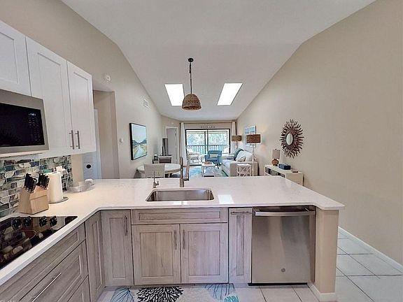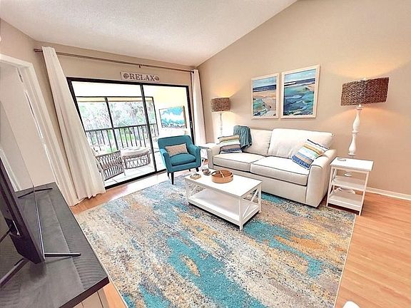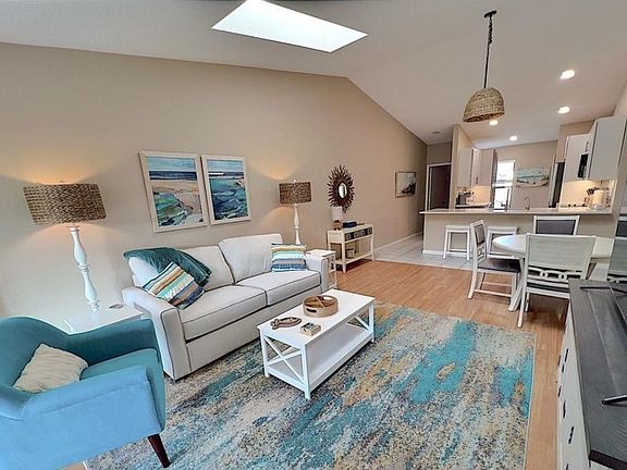 Experience bliss at this fully furnished seasonal rental condo! Just 10 minutes from the beaches, this bright and airy unit offers the ultimate in relaxation. A king bed in one bedroom and queen in the other, invite a relaxing night's sleep. Think high ceilings, skylights, and fancy upgrades galore. The sparkling new kitchen is a chef's paradise with top-notch appliances, beautiful countertops, and stylish cabinets. Unwind in the comfy bedrooms with luxurious linens and pamper yourself in the posh bathrooms. Breathe in the fresh air while sipping coffee on the screened-in porch, surrounded by chirping birds. Need to unwind after a beach day? The sparkling pool and hot tub await! Nature lovers will adore the nearby trails teeming with wildlife! This fantastic location puts everything at your fingertips - explore the area or just chill in your own haven. This condo is move-in-ready perfection, with everything you need, including brand new furniture and appliances!