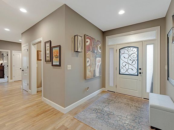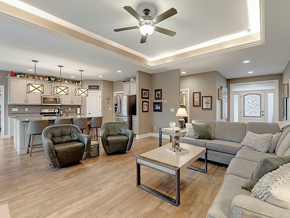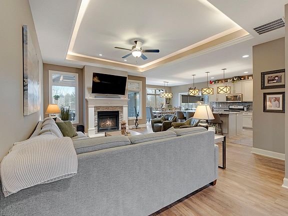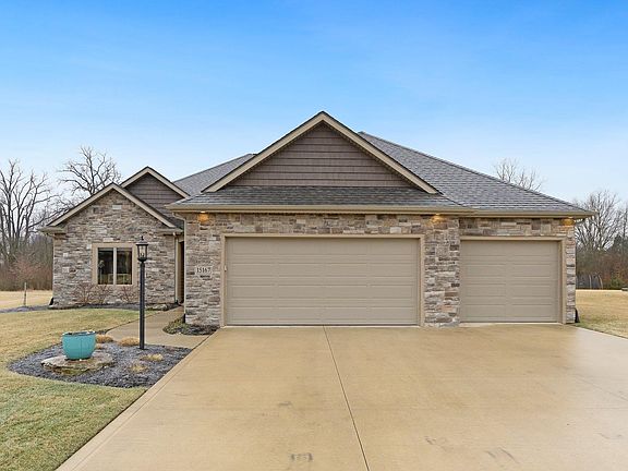 Immaculately maintained home on a private lot in the highly desired Lakes of Leo Creek. Many upgrades throughout the home, as this was a former builder model. This ranch home with a split floor plan has a large, open great room with a tray ceiling, crown molding, gas fireplace, and abundance of windows. The kitchen is spectacular - the custom cabinets, large island, tile backsplash, quartz countertops and stainless appliances make this any cook's dream. The sunroom is just off the kitchen/nook and makes a perfect den. There is a door leading from the nook onto a covered verandah. The master suite has a private entrance, tray ceiling, large walk-in closet with an island/packing station and a lot of shelves. Plus a spacious bathroom with a porcelain tile shower, double sink vanity, extra large linen closet and separate stool room. The laundry room includes a utility sink and additional cabinetry and countertop space. Other great features of this home are built-in lockers, sprinkler system, garage heater, professional landscaping, water softener, 9' ceilings, and wide-ladder pull-down attic access. This is a one-of-a-kind home that you won't want to miss!