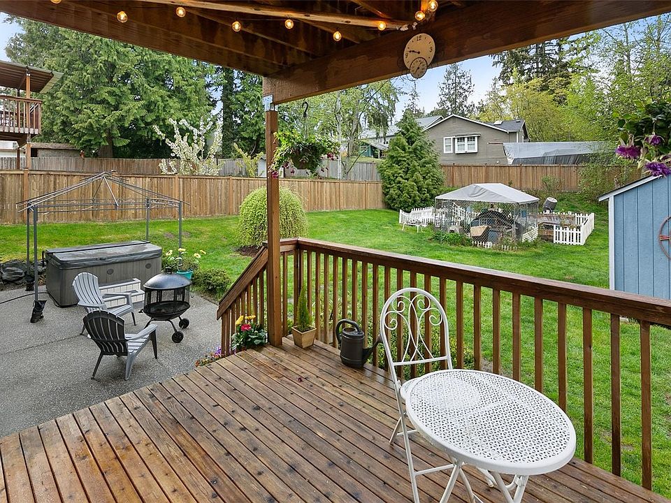 This amazing two-bedroom apartment is part of a beautiful home sited on a large .24-acre lot near beautiful Silver Lake. , separate entrance, completely private overlooking fully fenced backyard w/garden space & deck descending to patio w/ hot tub... Paved RV/boat parking, ample driveway space living room dining room. Walk to lake, shopping, dining, schools & more. For inquiries and Scheduling tours please Call 206 383 2135 the renter pays all the utility