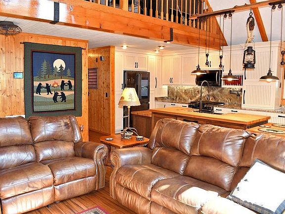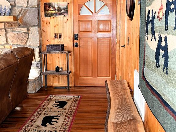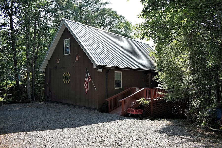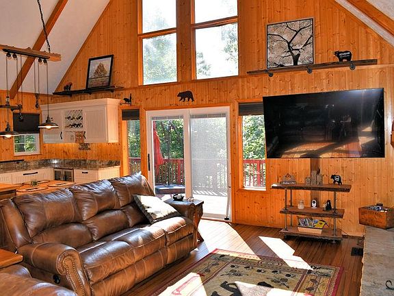 Once you are at ''Take A Hike Lodge'', you may never want to leave. Mature trees provide plenty of shade & privacy and with 1500 square feet of decking, there is plenty of space to enjoy the serenity of the mountain life from the wrap around deck on the main level with views of Bluff Mountain or the private, partially covered deck of the lower level. The outside space is nice but the WOW! factor is definitely on the inside. Natural light fills into the main level through the vaulted glass & wood wall, the glass patio door & flanking windows & triple windows from the kitchen. The open floor plan flows perfectly. The living room is anchored by an authentic stone fireplace hearth with handsome wood mantle. The kitchen is an absolute masterpiece. Truly a chef's dream kitchen w/custom cabinetry featuring self-close options, extending/sliding shelves, unique storage options including an appliance garage with electrical outlets,wine rack, spice cabinets-too many features to list. High-end stainless steel appliances, gas stove, granite counter tops, butcher block prep island, even a wine fridge. This kitchen has it all--even the lighting is a conversation piece with its unique pulley system light fixture over the island and built-in dining table. The vaulted ceiling is accented with exposed beams. Tastefully decorated, this cabin is being sold mostly furnished. A full bath and 2 guest rooms on the main level. Upstairs, you'll find a loft rec room with its own 1/2 bath & loft balcony overlooking the living room and kitchen. The owners spared no expense in creating their own mountain oasis and have used it as a personal residence but would make a great vacation home or overnight rental & could sleep 8-10 guests comfortably. The lower level is the master suite and it is massive. Wood-look tile flooring grace the lower level and it boasts its own full bath, large sitting area with toasty gas fireplace, spacious walk-in closet with custom shelving and even a large laundry room with side-by-side washer and dryer. The master suite also features a private entrance to the enormous lower level deck. Among just some of the recent improvements, it boasts a newer Lennox High-Efficiency HVAC unit (2018), new gutters w/Leaf filter, new appliances and new windows on the main level. Outside features a large and attractive storage building and even some space for your furry friends with a fenced-in dog run area. A custom-built outhouse offers a whimsical solution for mountain life-it is actually a bear-proof, garbage can storage area. Once you've visited the "Take a Hike Lodge", you'll tell all the other cabins to take a hike. This one will not disappoint.