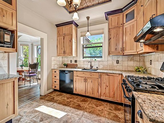 Victorian charmer on picture-perfect 7th street in Boise’s north end. Stroll to Hyde Park for dinner or to Camel’s Back for a foothills hike. The characteristic charm of the era welcomes you with a covered front porch, bayed windows and historic details. Soaring ceilings and abundant light make the living areas spacious and uplifting with gleaming hardwood floors, wood windows and beautiful woodwork. The remodeled kitchen features custom pull-outs and abundant storage, offering high function for the home chef. True en suite primary bedroom features beautiful clawfoot tub. This smart floorplan boasts two additional bedrooms and full bathroom on the main level as well as laundry on the main for true single-level living that is hard to find in this location. Attic was finished with an artist’s touch, featuring cozy natural wood details and custom stained glass with classic Idaho scene. Wonderful backyard features grape arbor, garden boxes, fruit trees and charming paver patio. Full automatic sprinkler system.