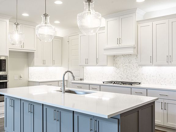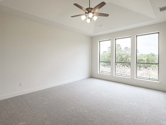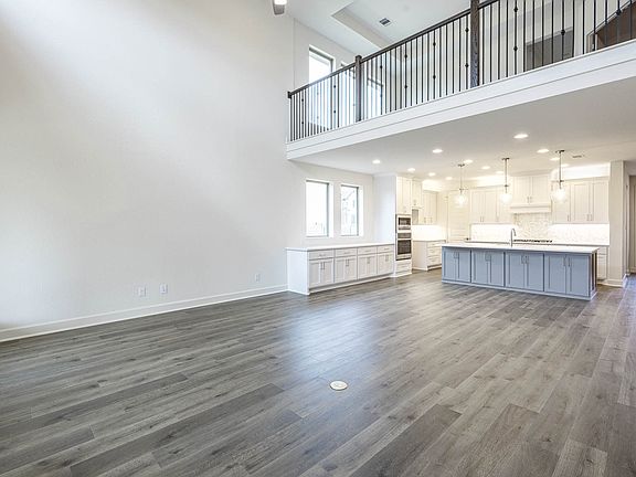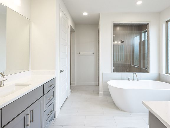 Front porch opens into the entryway. A private guest suite off the main hallway features a full bathroom and walk-in closet. The kitchen hosts an island with built-in seating, 5-burner gas cooktop and corner walk-in pantry. The dining area connects the living spaces. The two-story family room boasts a wall of windows and the entrance to the covered backyard patio. French doors open into the home office off of the family room. The primary bedroom hosts a wall of windows. The primary suite offers dual vanities, a garden tub, glass enclosed shower, two walk-in closets and dual access to the utility room. On the second level you enter the game room with ample natural light. French doors open into the media room. Secondary bedrooms with walk-in closets and two full bathrooms complete the upstairs. The mud room with storage is located off of the three-car garage. Representative Images. Features and specifications may vary by community.
