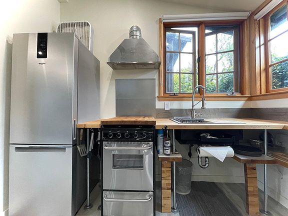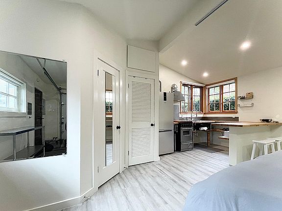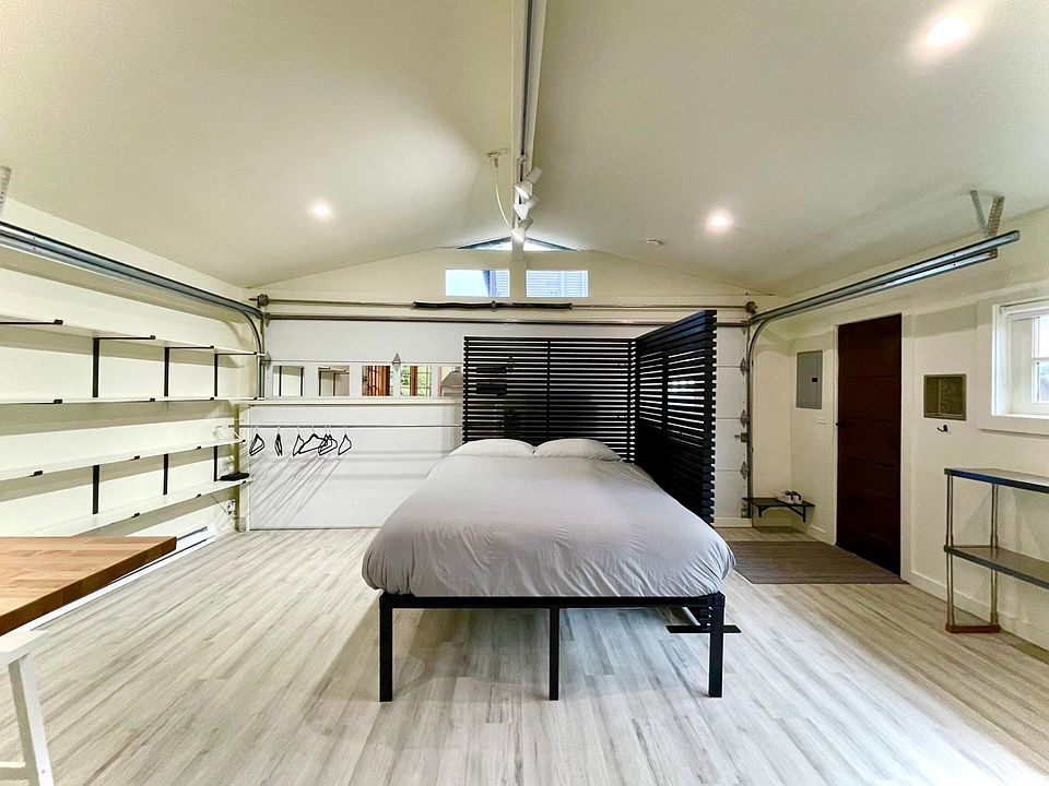 Gated, private, new, detached studio garage-conversion home, one block away from the North Berkeley BART Station. Flexible lease terms. Prime location on Berkeley's iconic "Bicycle Boulevard". Modern, open-concept, furnished, smart space-saving design, luxury studio apartment. Full bath, gas appliances, refrigerator, and washer/dryer. Brand new floors, fixtures, appliances, and heater. Bedding, towels and basic kitchenware on premise. Permitted street parking. Fenced private porch for outdoor bike storage. Security camera monitored, security-gated shared entrance on three unit property. Two week minimum lease term: $945 per week including internet and utilities. Three month lease term: $2400 per month ($2150 + $250 flat rate internet + utilities) Utilities includes high speed fiber internet, water, laundry, sewage, trash, gas, electric, and landscaping. Solo occupancy only. No smoking, no pets. 3+ month lease term available 2+ week lease term available 1 Month rent $2150 Flat rate utilities of $250 per month includes high speed internet, water, sewage, trash, landscaping maintenance, and electric. Total monthly rate $2400