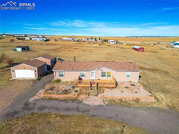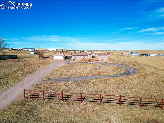 Enjoy country living w/all the city amenities nearby! 4BR, 2BA home nestled on a 2.6-acre, horse-zoned lot, located in the serene, rural Peyton community of Southfork. This home offers the perfect blend of tranquility & convenience. As you approach the front entry, you'll be greeted by an expansive composite deck that leads you into the bright & open floor plan of the home. Large living spaces w/vaulted ceilings create an inviting atmosphere, perfect for entertaining your family & friends. Stay comfortable year-round w/lighted CFs, & gas heat. The Living Rm boasts neutral carpet & a large window that floods the room w/natural light. It flows into the spacious Dining Area & Kitchen. The Dining Area features wood laminate floors & a lighted ceiling fan. The Kitchen boasts a counter bar for informal dining, a pantry, & wood cabinets w/tile countertops for kitchen storage & easy food prep. Appl inc a gas range oven, dishwasher, & stainless-steel side by side refrigerator. The adjacent Laundry Rm offers access to the side entrance & the washer/dryer stay. The Primary BR, located off the Living Rm, offers a private retreat w/neutral carpet, a lighted ceiling fan, walk-in closet & adjoining 5pc Bathroom w/vanity, mirrored medicine cabinet, tub, & separate shower. There is a Family Rm off the Kitchen that has a wood burning FP w/tile surround & wood mantle adding cozy ambiance to the space. 3 more BRs w/neutral carpet & lighted ceiling fans share a full bathroom w/vanity, mirrored medicine cabinet & tub/shower. The backyard offers a wood deck for outdoor fun & relaxation. Rear fencing ensures privacy & security. The property also features a 4-car detached garage w/door opener & barn for your horses. With plenty of room for corrals for your horses, & pens for your other animals, this property offers endless possibilities for the outdoor enthusiast & animal lover. Convenient location, close to schools, parks, & trails. Easy 15 min commute to Peterson Space Force Base.