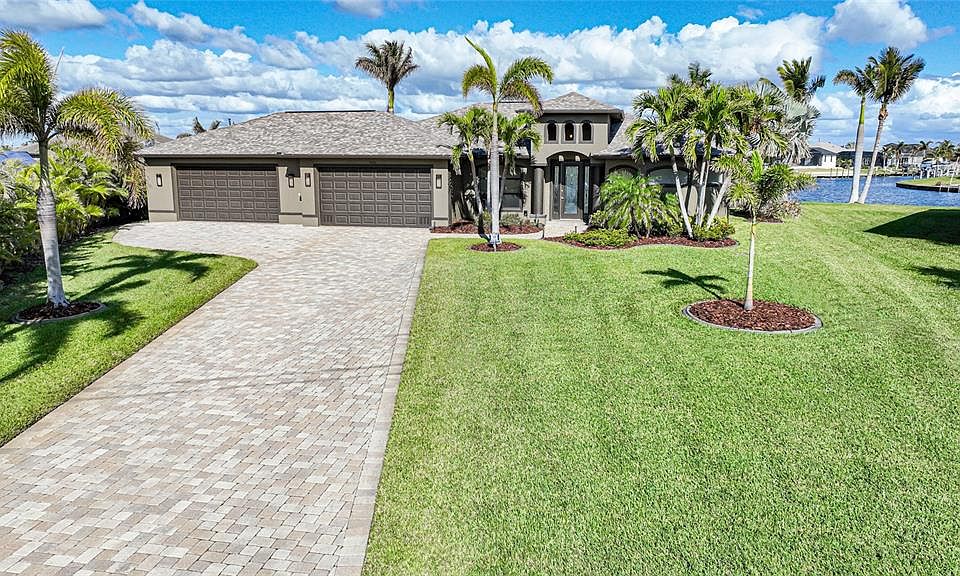 This exceptional waterfront home, meticulously crafted by DM Dean, is now available in the desirable South Gulf Cove community. Perfect for outdoor enthusiasts, this property offers an ideal lifestyle for both full-time residents enjoying the Florida sun and snowbirds seeking a tranquil retreat during the warmer months. Boasting 3 bedrooms, 2 bathrooms, and a 4-car garage, the home is situated on a nearly half-acre corner TIP LOT with a 155-foot seawall. Boating lovers will appreciate the private 38' Azek dock with electric, water, and a 10,000 lb. boat lift, only minutes to Myakka/Charlotte Harbor. From the moment you arrive, you’ll be impressed by the stunning landscaping, outdoor lighting, and extended brick paver driveway and walkway leading to the elegant arched entryway. The luxury glass front door opens to an open-concept floor plan flooded with natural light and immediate water views. Tile flooring throughout enhances the spaciousness, while tray ceilings and zero-corner sliders in the living area seamlessly connect the indoor and outdoor spaces. The gourmet kitchen features granite countertops, a stylish subway tile backsplash, a large center island with pendant lighting, stainless steel appliances, a beverage refrigerator, and Shaker-style cabinetry with crown molding. Overlooking the Great Room and dining area, it’s ideal for both cooking and entertaining. Sliders open to the lanai, offering breathtaking water views. The master suite is a private oasis with a double tray ceiling, private pool/lanai access, a large walk-in closet, and a luxurious ensuite with a walk-through Roman shower and dual granite vanities. On the opposite side of the home, two spacious guest bedrooms share a full bathroom. The expansive back lanai is truly a standout feature, with a heated saltwater pool that has new Pentair color changing lights and sweeping water views, perfect for enjoying Florida’s sunrises. The fully-equipped outdoor kitchen, with a Cypress wood ceiling, stone accents, large granite countertop, ice maker, cooktop, bar seating, flat-screen TV, and sound bar, creates an ideal space for year-round gatherings. After a swim, the outdoor shower off the pool bath adds convenience. The impressive 4-car garage features insulated, epoxy floors and ample space for cars, boats, and toys. It includes heavy-duty wall cabinets, storage bins, and a retractable garage screen door. Additional overhead roof trusses allow for expansive attic storage. The garage is designed for maximum functionality, offering space for a workshop or storage of tools and equipment. Home also features laundry room with two storage closets, washer/dryer, and granite countertop folding station with sink. Recent updates include new irrigation pump 2024, new pool pump & filter, resurfaced pool, new pool cage, and new roof (2023), along with a new A/C system, dock lighting, pool tile, and salt cell insert, Additional upgrades include a exterior paint, extended boat lift, and new landscaping (2021), along with new lighting inside and out (2019). The home is wired for a whole-house generator hookup, providing added peace of mind and convenience. South Gulf Cove is a great boating community with optional annual HOA. Access to 55 miles of canals plus Charlotte Harbor. This home is located just minutes away from Englewood and Boca Grande beaches, shopping, great restaurants, entertainment and if you’re a golfer, Rotonda is just around the corner, which offers 5 golf courses.