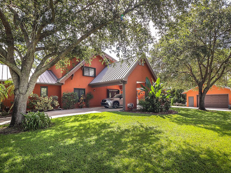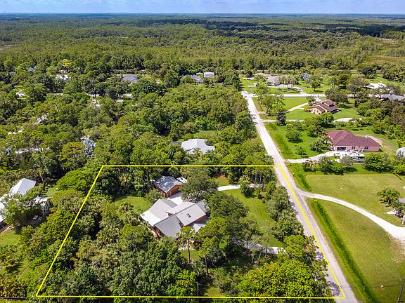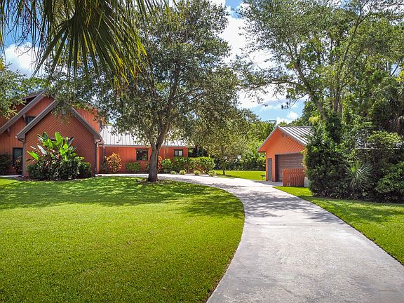 This beautiful custom home features 3 bedrooms (very easily converted to 4), 2 baths, a 2-car detached garage, oversized screened patio, and is located on a 1.23-acre lot in Palm Beach Country Estates. One of the bedrooms was designed as a flexible space: currently a large 24x12 room that can easily be divided into two separate bedrooms, if desired. Soaring vaulted wood ceiling in the great room with large picture windows that let in tons of natural light. Kitchen features granite countertops, stainless steel appliances, and a large center island. Large breakfast area in addition to the formal dining room. Metal roof. Impact glass or accordion shutters on most windows. Office area nook on the upstairs loft area leads into the oversized master bedroom with spacious walk-in closet. Master bath features vaulted ceiling with skylight, Roman tub, separate walk-in shower, and toilet room with bidet hookup. Beautiful property with mature trees providing lots of shade and privacy. Tons of extra parking space with a gated concrete circular driveway, attached porte-cochere wide enough for two cars, and RV/boat parking areas on both sides of the garage. Palm Beach Country Estates features country living with no HOA, city water, and close proximity to area amenities such as Alton Town Center and Abacoa.