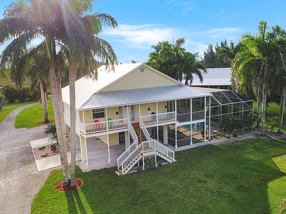 4/3.5 home a truly magnificent, Key West style gem in Jupiter Farms. A true entertainers dream! This 4 bedroom, 3.5 bathroom, 2,800 square foot custom William Dean home sits on a 1.18 acre former tree nursery. There's an abundance of beautiful Sabal palms, mature Royal palms, Coconut palms, Robellini palms and Live Oak trees. This home has an open-concept kitchen/dining/living area as well as two Master bedrooms with full bathrooms and walk-in closets. One walk-in closet is 13x11 and can be converted to a study/office. The other two bedrooms are 14x12 with a jack and jill bathroom. This home is complete with a 1-year NEW metal roof, enormous screened in pool area with a second floor entertaining covered porch that extends the width of the home and wraps around the front. There are 5
