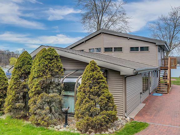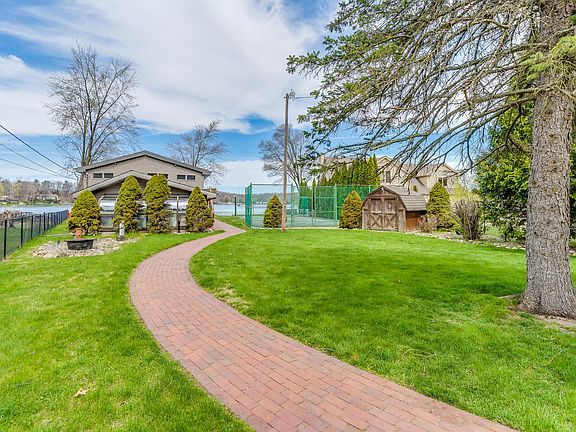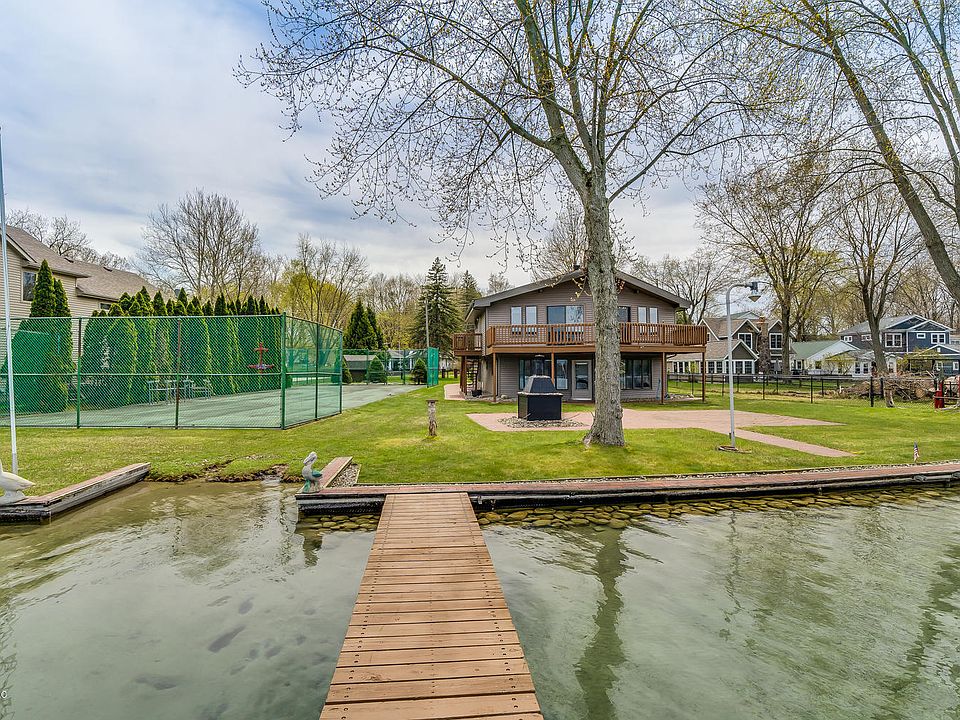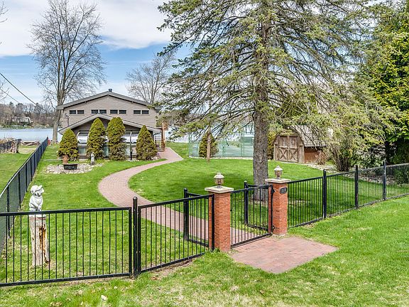 Charming 3 BD 2 BA 2,698-sq-ft home on double lot w/ 128 ft waterfront on Birch Lake, fenced tennis court, large backlot w/ 1,200-sq-ft heated Morton Building. Lot is large enough for second house. House has large windows, broad upper deck, covered lower patio, 3-season room, brick patio w/ custom-built chimneyed fireplace near water. Upper level: large living room w/ vaulted ceiling, exposed natural beams, Midcentury Modern fireplace designed by Wendell Lovett, deck access, panoramic lake views; dining area w/ lake views; sink for wet bar; 3 BD; 1 BA; outside access. Spiral staircase down to sitting room w/ 3-season room and patio access, dining room, kitchen w/ bar seating and casual dining, 1 BA. Street-side lawn has wrought iron fence and brick path to the home.