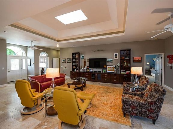 - Interior Features: Ceiling Fans(s), High Ceiling(s), Master Bedroom Downstairs, Open Floorplan, Split Bedroom, Walk-In Closet(s), Solid Wood Cabinets, Living Room/Dining Room Combo, Solid Surface Counters, Built in Features, Window Treatments, Skylight(s)