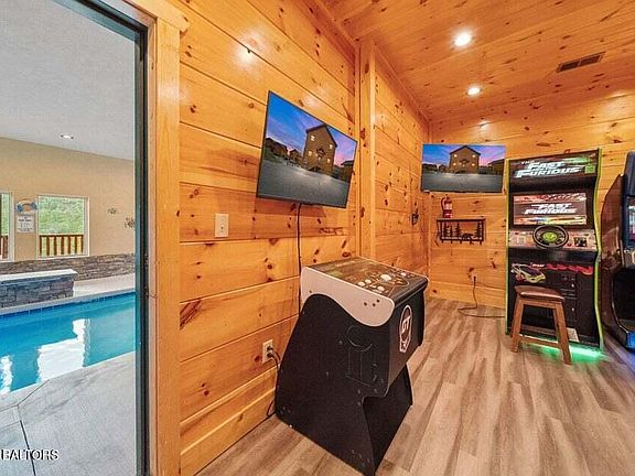 UNBELIEVABLE PRICE! WOW FACTOR! CHECK OUT THE OVERSIZED HEATED INDOOR POOL WITH WATERFALL AT THIS 4BR/5.5 BA CASH FLOW SHORT TERM RENTAL INCOME PRODUCING CABIN WITH MTN VIEWS, GAMEROOM, AND AMAZING LOCATION! SOLID RENTAL HISTORY WITH THE LAST TWO YEARS AVERAGE BEING $92K AND PROJECTIONS OF UP TO $120K ONCE SOME MINOR INTERIOR UPDATES ARE MADE. USE YOUR IMAGINATION AND MAKE THIS LUXURY CABIN POP! TURNKEY AND LOCATED IN SEVIERVILLE, TN! Interior features include tongue and groove, luxury vinyl plank flooring throughout, all Master Suites have en suite bathrooms, recessed lighting, three levels of decking, and more! Open floorplan with living room with electric fireplace, oversized fully equipped kitchen with snack bar for additional seating, and a half bath on the main level. Huge Master Suite with fireplace and en suite bathroom. All bedrooms are very spacious with en suite bathrooms, and one bedroom has queen over queen bunk beds. Setup to maximize sleep space! Huge arcade gameroom on lower level and a massive indoor pool room with a stone waterfall, its own half bath, shower, private deck access with bubbling hot tub, outdoor seating, and more! This is a must see! One-of-a-kind opportunity to have ALL THE AMENITIES needed to max out ROI.