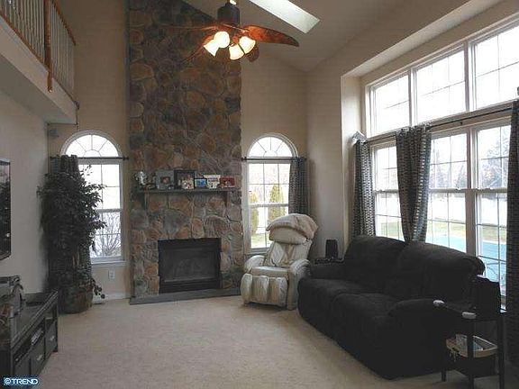 Stunning stone-front colonial with elegant portico is nestled on a quiet cul-de-sac in desirable Hunters Crossing is conveniently located minutes from 309, 313, 113, PA turnpike, Quakertown airport, Richland Plaza, & Quakertown Mall. Largest model in the development, complete with new EP Henry patio, privacy fence, walk-up basement, and luxurious in-ground swimming pool with brand-new liner! Your expansive backyard oasis backs up to lush woods. Enjoy the secluded privacy! The bright, 2-story foyer features sunburst windows, gleaming hardwood floors, custom wainscoting, and retractable chandelier. The sun-drenched kitchen features plenty of oak cabinets, recessed lighting, island, real hardwood floors, large pantry, and breakfast room. The spectacular great room boasts cathedral vaulted ceilings with skylights, transom & starburst window accents, dramatic floor-to-ceiling stone fireplace, and plush carpeting. The elegant dining room has custom marble flooring, designer paint, and leads to the formal living room! The master suite has tray ceilings, Brazilian cherry floors, walk-in closet, sitting room/study, and extravagant master bath, complete with huge soaking tub, Jack-n-Jill Sinks, and separate shower stall! All the additional spacious bedrooms have beautiful cherry floors, sophisticated neutral paint, double-hung windows, and huge closets. Don't forget the extra storage shed is included! Easy access to State Gamelands 196 & 139, the Promenade Shops, and Sands Casino! 03/19/15