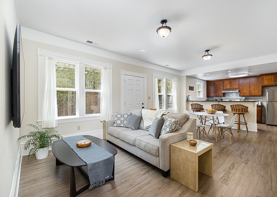 Welcome to Mozart's Flat: elegant spaciousness with no stairs. Enjoy tons of natural light and high ceilings in this ground floor unit on a charming tree-lined lane. Entire unit has been fully renovated. Large kitchen with gas stove, expansive countertops, excellent appliances. Fully enclosed private patio. Laundry is shared with just one other unit. * Tenant pays utilities except water * One year lease * Street parking only * No smoking of any kind
