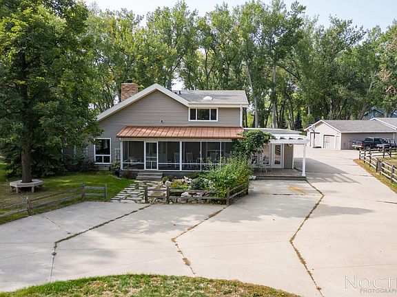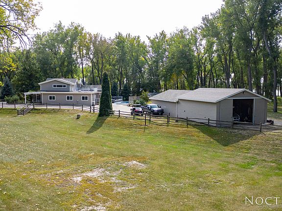This remarkable RIVERFRONT property is located just 15 minutes North of Bismarck. The property offers a ranch/retreat like feel, with over 300ft of river frontage, a POOL & HOT TUB area, detached garage/barn, with lots of green areas around the property, this property is also zoned for HORSES and is fully fenced, all of this is situated on roughly 6 ACRES (2 riverfront lots)! The home has been updated through-out and offers plenty of room for any family or perfect for those who like to entertain! The main-floor offers 3 bedrooms/a den, a full bathroom, a 3/4 bathroom, a double island kitchen with plenty of updates and cabinet space. The main-floor also offers a unique library area and seating area with a fireplace area for reading or entertaining, a formal dining area, and a separate game room area as well of the main family room. The upper level offers the master suite and master bathroom, with a seating area loft just outside the master bedroom that leads to the roof-top deck. Don't miss-out on this one of a kind property!