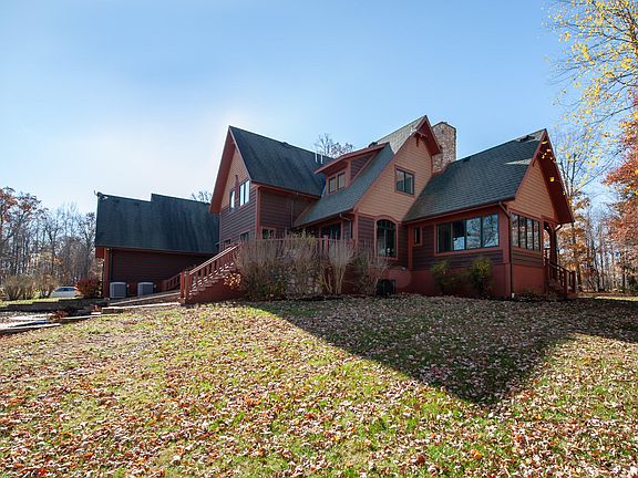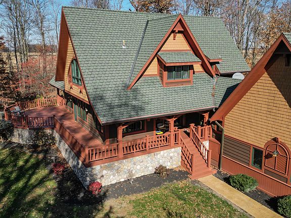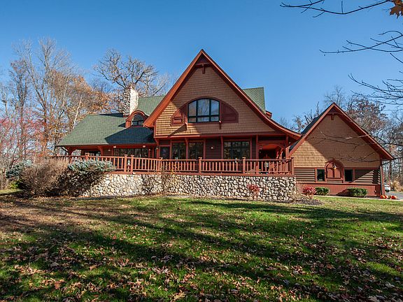 Vacation at home in this Four bedroom, Four Bath Chalet / Lodge style home. The home rests on two lots totaling @ 4.8 acres of secluded , wooded property. The winding paved driveway leads you through the trees to the Cedar and stone home that was designed to blend in with the beautiful surroundings. Exterior features mature trees with ample yard space and plenty of outside entertaining areas with decks and patios. The interior of the home boasts higher end finishes throughout and bonus spaces in the walkout basement and the Poolroom above the garage. New Custom sidewalks and walkout basement patio installed 2023. Dual Carrier Heat Pumps installed 2015.