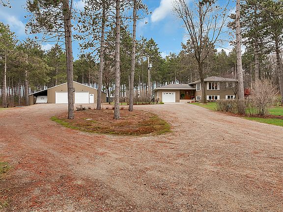 This meticulously maintained one owner home has 3 BR, 2 BA, is nestled amongst 10 acres of towering pines and majestic oaks and is located right across the road from the 8th hole of the golf course. Updated kitchen w/granite CT's, SS appliances, Oak cabinets, Hickory floor. Upper and main floor bathrooms have in-floor heat. LL family room w/gas fireplace. Solid oak 6-panel doors, Andersen windows, large deck off dining room. 54x36 pole shed + 12' lean-to. Walking/ski trails throughout the property.