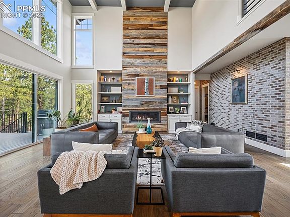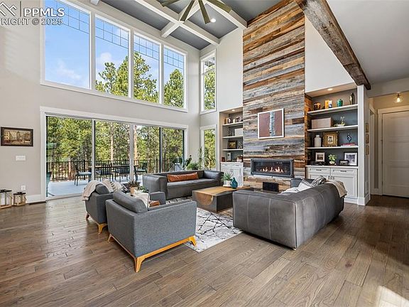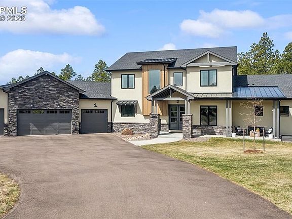 Modern farmhouse in Flying Horse North with views of the golf course from the porch! You are welcomed into this majestic home with steel double doors, hard wood flooring, and brick wall with barn wood door to the front office! This elegant and cozy home draws you into the two story family room with two story fireplace and custom ceiling work! The spacious family room allows space for oversized furniture and walks out through double sliders onto the massive deck! The room opens to your gourmet kitchen with quartzite counters, high end appliances to include dual fuel range, Bosch dishwasher and wall oven, drawer microwave, apron sink and cabinets to the ceiling! Scullery with another refrigerator, granite counters, cabinets and open shelving and sink. The dining room is a magical place with a stone wall and windows surrounding you with trees! Another brick wall leads you to the hall bath with custom concrete sink. The main level private master retreat is surrounded by mature pines. Barn door leading to the spa like master bath featuring a Victor and Albert freestanding tub, stone wall, dual walk-in shower with 4 shower heads and separate sitting areas, two vanities and custom walk-in closet. Right off the oversized garage is your laundry/mud room with two benches and locker/cubby areas, included washer/dryer, another sink and a window with views of the golf course! The massive 4 garage has an area of benches and storage, 2 EV plugs and hot/cold water spigot. House includes a back up generator! Upstairs you will find a carpeted loft, junior master bedroom with attached full bath and another bedroom and 3/4 bath! The walkout basement has a fireplace, wet bar and custom home theatre, and two more bedrooms and baths, a hidden room and a garage door for your work out room! All this on 2.98 quiet treed acres! Full golf membership included! Flying Horse North is the one area you can enjoy treed golf course acreage!
