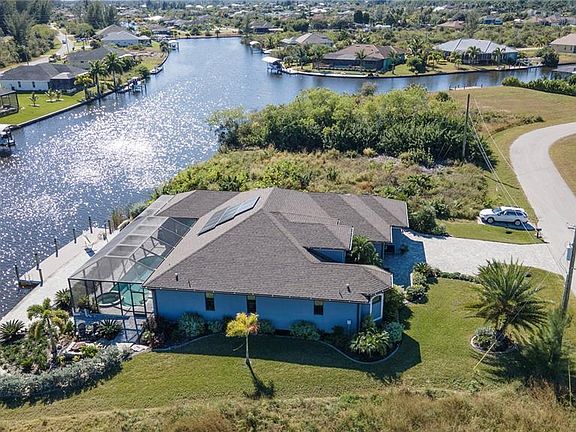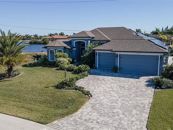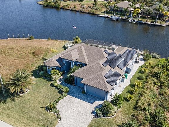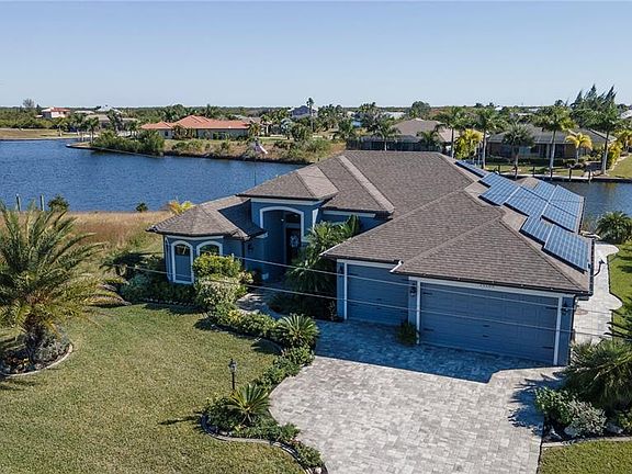 Stunning custom WATERFRONT home built by DM Dean located in a quiet neighborhood in desirable deed restricted South Gulf Cove. ** FABULOUS WATER VIEWS ** This light and bright home offers 3 Bedrooms, 3 Bathrooms and a 3 Car Garage. This house is being sold *FURNISHED*. Ask your agent for the attached list of furniture items included in the sale of the property. There is a spacious open and split bedroom floor plan with Great Room, Family Room, Office/Den, well appointed Kitchen and Inside Laundry. Upgrades throughout the house. Breathtaking water views from most rooms! The Great Room features floor to ceiling built in shelving around a stylish electric fireplace, double tray ceiling, and disappearing edge sliding glass doors to the lanai. The Family Room offers a tray ceiling and sliding glass sliders to the lanai. The Office/Den has crown molding and a large window for lots of natural light. The Kitchen features wood cabinets with crown molding, gorgeous granite counters, fingerprint resistant stainless appliances, breakfast bar, dry bar and dining area with French doors to the lanai. The spacious Master Bedroom suite offers a tray ceiling, access to the lanai via French doors, TWO full bathrooms one of which is a Pool Bath with wood cabinets, granite counters and large walk in shower. The main master bathroom features his and hers sinks, jetted soaking tub, large Roman shower with bench, wood cabinets and granite counters. There are two additional bedrooms and guest bathroom has wood cabinets, granite counters and large walk in shower. Your living space extends via French doors and sliding glass doors to the screened lanai and pool area with paver deck, spacious covered area with paver flooring, open deck for sunbathing, summer kitchen, outdoor shower, solar heated inground pool and attached inground spa. Continue to the waterfront with another paver deck, 40 foot plastic/composite dock with water, electric and lighting, concrete seawall. SAILBOAT WATER deep water canals and only 10 minutes to the lock/Charlotte Harbor and on to the Gulf of Mexico. Other features include: house is ADA wheelchair compliant, paver driveway and walkways, high ceilings, tray ceilings, ceiling fans, manicured lawn, fire pit, lovely tropical landscaping, wood look tile flooring throughout the house, hurricane shutters, large windows. This all electric house is powered by solar panels. ** You will love your electric bill ! ** Hurricane rated storm shutters provide added security to the lanai with the push of a button! And it adds almost 300 SF under air! Utilities are county water and sewer. The HOA is voluntary. This home has beautiful design features and will not last long on the market!
